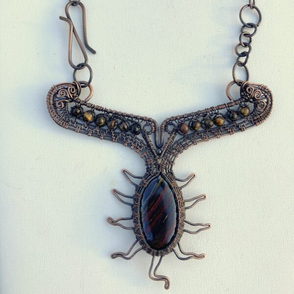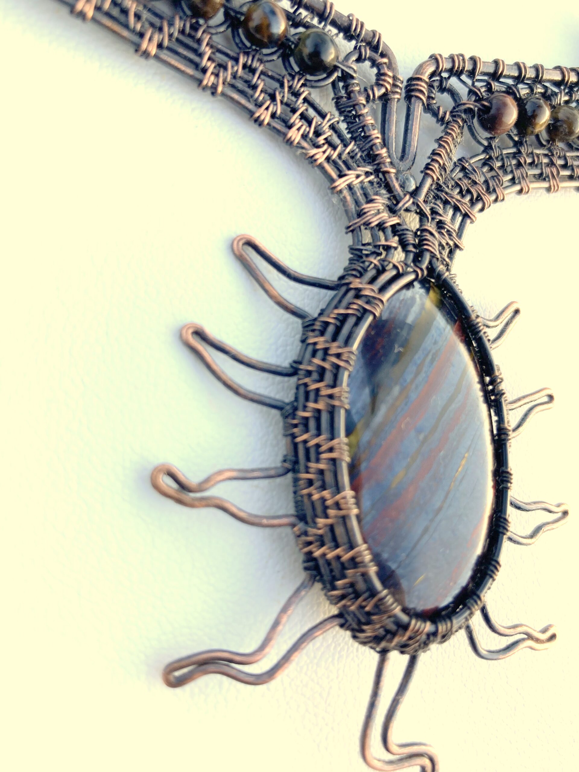 An unusual Red Tigers Eye gemstone with Golden Tigers Eye accents. A handmade setting and clasp; the stone is wrapped and woven in copper wire, antiqued and polished. Unique, one off statement piece. The stone has streaks of gold across it, like a ray of light opening into another world or even the stars. I have called it "Dark Materials" because of its resemblance to a portal to another place. It is subtitled "Per Ardua ad Astra" as it has wings at each side!