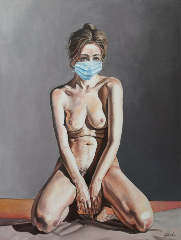 This is a part of a series of paintings created during the recent worldwaide pandemic. It's a female nude study but with a contemporary twist. By adding the, now very familiar mask, the painting is brought very up to date.
