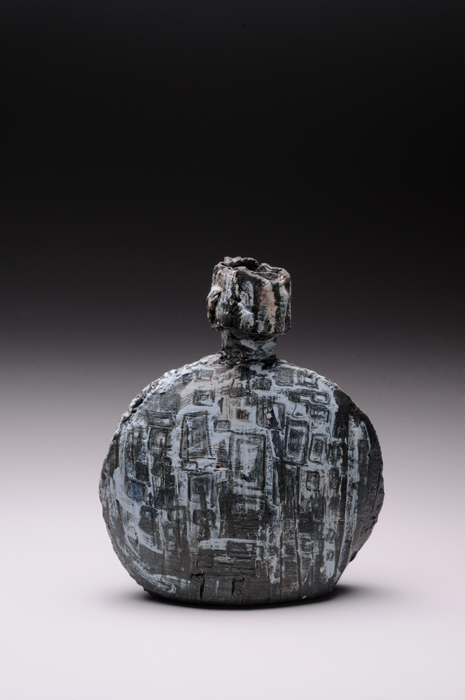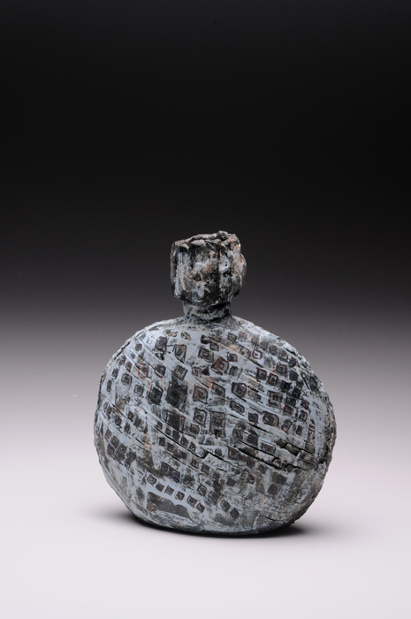 This piece is inspired by the industrial machinery at Coldharbour Mill. The surface is covered in a pattern of many repeated squares of different sizes echoing the rhythm of factory sounds and moving parts. Its’ surface has an industrial-feel created using a dark glaze with a strong metallic-like surface. The vessel is hand-built from slabs of earthenware clay with many layers of blue and cream slip added, and glazes. Each layer undergoes a separate firing. Some layers are worn away in parts to bring a sense of history to the surface. The mark-making gets larger as the eye travels up the piece, suggestive of a crescendo of factory noises the nearer you get to the moving looms. Rhythm I belongs to my Coldharbour Collection which is a series of unique one-off limited edition ceramic sculptures which celebrate and shine a light on weaving skills. It's inspired by my time at Coldharbour Mill, near Tiverton – one of the oldest working woollen mills in the UK – where I spent a year learning about the skilled job of weaving.