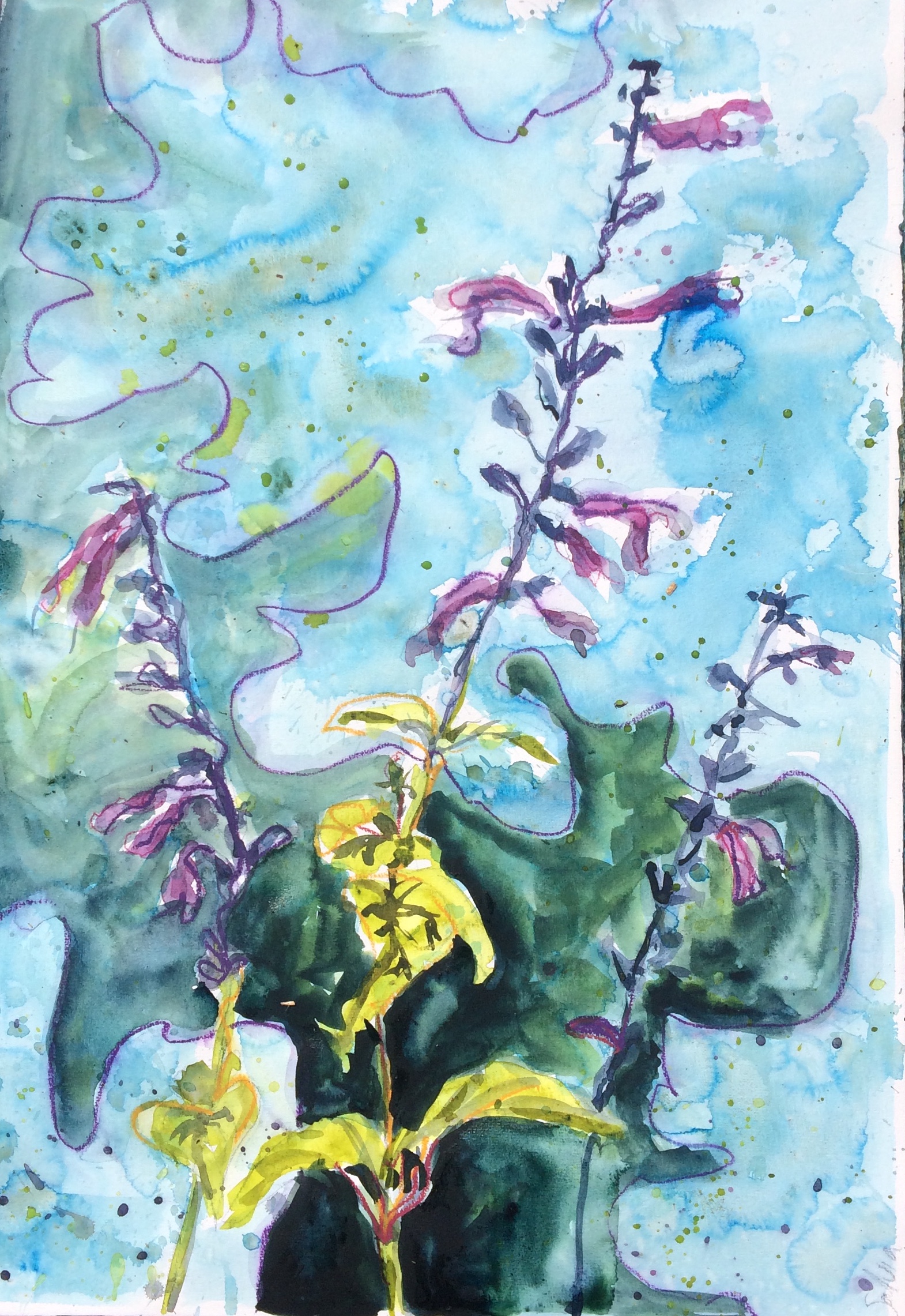 Painted from life in a friend's garden using watercolour and other materials. Done quickly and with big gestures. I came home and planted salvia in my garden too!